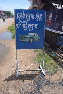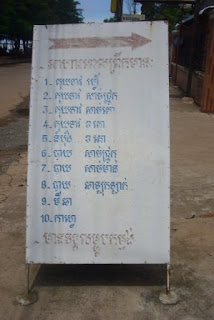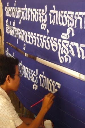 They are everywhere I go, offering simple illustrations for those who can’t read and beautiful Khmer script for those who can. These are usually painted on metal plates as with the one above or, as you can see from the man at work below, on fabric for stretching across an entranceway e.g. for schools and other municipal buildings. Here is a small selection and some pictures of a signwriter at work who I happened to stumble across.
