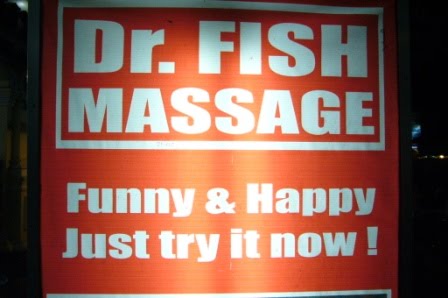 Found in Siem Reap, advertising a foot-bath filled with tiny fish who eat all your dead skin. Perhaps not the most hygienic thing in the world, but certainly funny and happy.