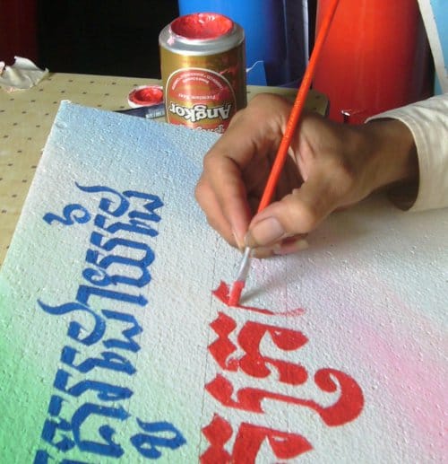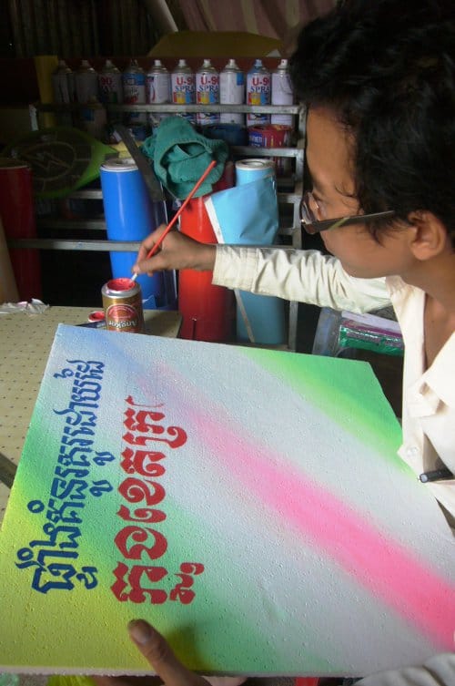 Today, after three weeks of checking back on an almost daily basis, I caught Kratie signpainter Chouk Rachana at work on the cover for my forthcoming book, ‘Hand Painted Signs of Kratie’. It has taken a bit of back and forth to get towards a common understanding of what I’m looking for and I think he is now on the right path. Here are some photos and a little video (more here) to whet the appetite, I’ll be checking back again soon in the hope of catching the next application of the paint…