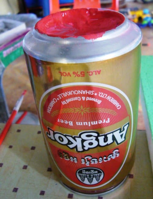 An upturned beer can makes for a novel palette for his paints.