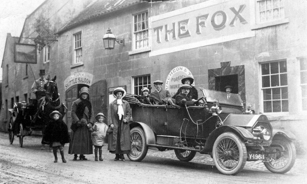 Over on the other side of Bath, members of the Harbutt family from Bathampton (of plasticine fame) pose for a group portrait outside the Fox at Midford, between Hinton Charterhouse and Bath. In the early days of motoring, only the upper-middle classes could afford a vehicle like this. Even so, breakdowns were common, which probably explains why they brought the horse-drawn carriage along as well. How could they have foreseen that a century later there would be a constant stream of traffic past this former inn, with no need of horses in case of breakdowns, and that any attempt to recreate this scene today would risk at best a stream of irate drivers, at worst serious injury? The Fox closed over 60 years ago, but traces of the advertising roundel partially obscured by the car can still be seen today.