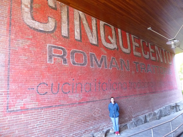 Several months ago, Josh and I received a request to paint a faux ghost sign in an alleyway for a restaurant called Cinquecento in Boston’s South End – a neighbourhood known for its abundance of authentic ghost signs, most likely painted between 1850 and 1950. The designer wanted the sign to look authentically antique – like the sign (and hence the restaurant) had been there for many years and the modern neighbourhood had grown up around it. He achieved this effect by cutting off the tops of the letters to make the sign appear as though the ceiling that connected the two buildings on either side of the alleyway had been built years after the sign had been painted. The desired effect was an evocation of longevity – even though the restaurant was highly anticipated and opened in a premium location which had housed another popular (yet short-lived) restaurant in the years previous to the opening of Cinquecento.