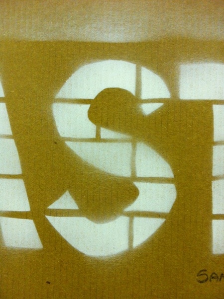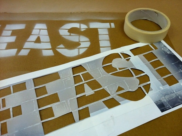 To create my piece, Sarah Hyndman of Type Tasting kindly let me into her studio near my home in Stoke Newington to do something experimental with a stencil. This reflects the intersection of the brickwork and the lettering, a key aspect of ghostsigns in general. Here I am at work…