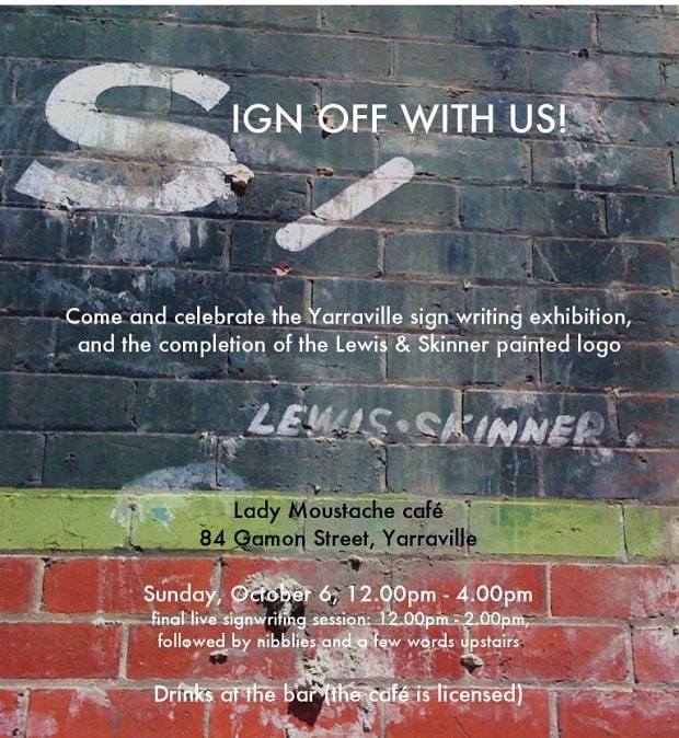 In addition to the online archive there is an exhibition of hard copy materials running from this Wednesday, 2nd October until Sunday, 6th October. During the exhibition there will be live signwriting demonstrations from local signwriter Tony Mead every lunchtime. Further, there will be an event on 6th October which will see Tony complete his work on a large-scale production of the Lewis & Skinner logo on a Melbourne wall (see flyer below).