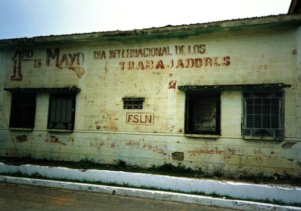 While preparing for Wednesday’s talk at St Bride I rediscovered this in an old photo album from my 1998 travels in Central America. It is from Nicaragua, celebrating 1 May, International Workers’ Day. I believe this may be my first ever ghostsign photo, predating the fountain pens one in Stoke Newington by about eight years.
