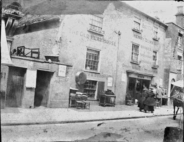 This older photo again shows Dunn’s shop but this time with a different wording. It also gives the date of business being established as 1798 at the top. Thomson hasn’t moved in next door yet but there is another business using the same portion of wall to advertise teas. (Perhaps at a later date there was a palimpsest of the two signs?) There is also a lot of painted signage, including one for The Old Play House, on the wall adjacent to Henry Dunn’s main shop, and also some on the smaller protruding wall beyond that, ‘…for hire’.