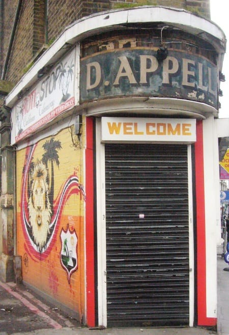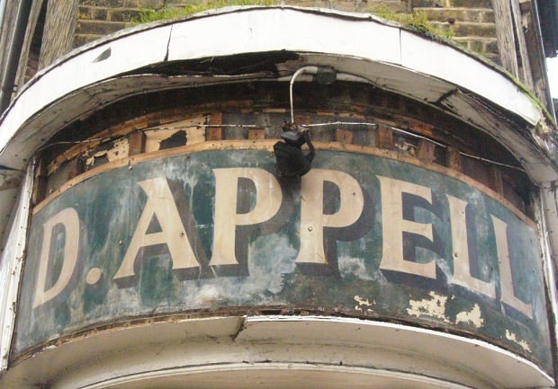 Ghostsigns are regularly revealed by property development and the updating or removal of billboards. This is the first instance I’ve come across of the weather, in this case the wind, leading to a shop fascia becoming visible once again. The ‘Valentine’s Day Storm’ last Friday ripped the Roti Stop sign off this corner building, leaving this incredibly well preserved sign for D. Appell. It can currently be seen at 36b Stamford Hill.