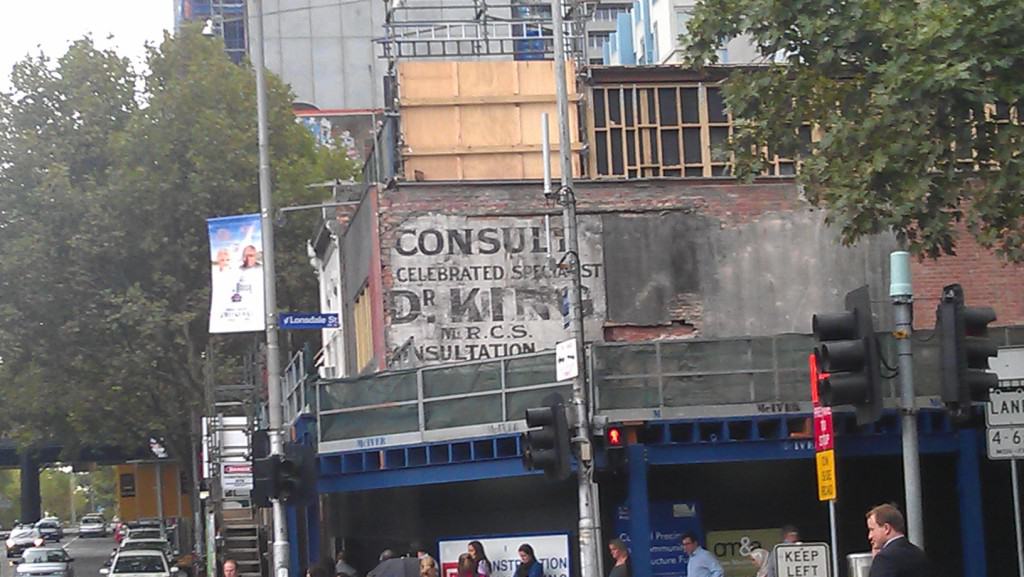 This Melbourne ghostsign is a recent reveal and was captured by Nick Gadd, the writer behind Melbourne Circle. Nick’s research into the sign was recently published in an anthology of papers titled ‘Melbourne Subjective‘. He investigates the sign and creates a tentative hypothesis about who Dr King was with reference to a fictitious, but plausible, customer/patient. It shows how ghostsigns and their stories are necessarily incomplete and that this allows us to join the factual dots with our own imagination. This is something I do on my tours, although I do stress what is fact versus my own speculation. Nick has kindly shared his full paper which you can download here, I really recommend you do.