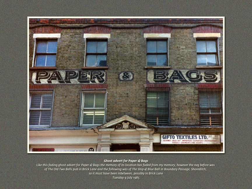 Philip Marriage got in touch with the photograph above, taken in the Spitalfields area in 1985. It is part of a wider collection of archive photos that he has, many published on the Spitalfields Life blog here. Philip has been trying to pinpoint the locations of each of his photos, with some being easier than others. This Paper & Bags picture is one that he hasn’t been able to place and so I suggested putting it out to the wider Ghostsigns community to see if anyone can help.