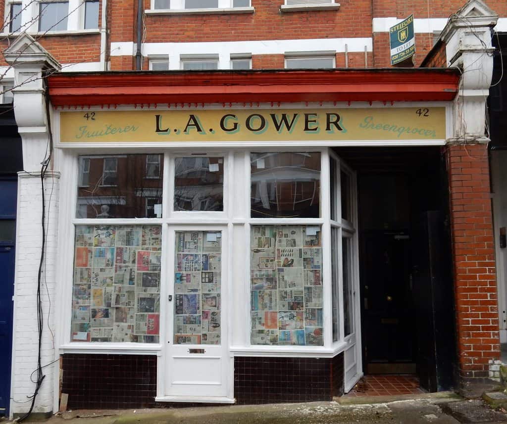 Finally, back over on the other side of the road is this fascia board for L.A. Gower, Fruiterer and Greengrocer. This looks like it has been retouched, or was covered relatively quickly after being originally painted.