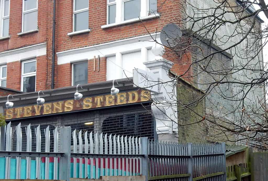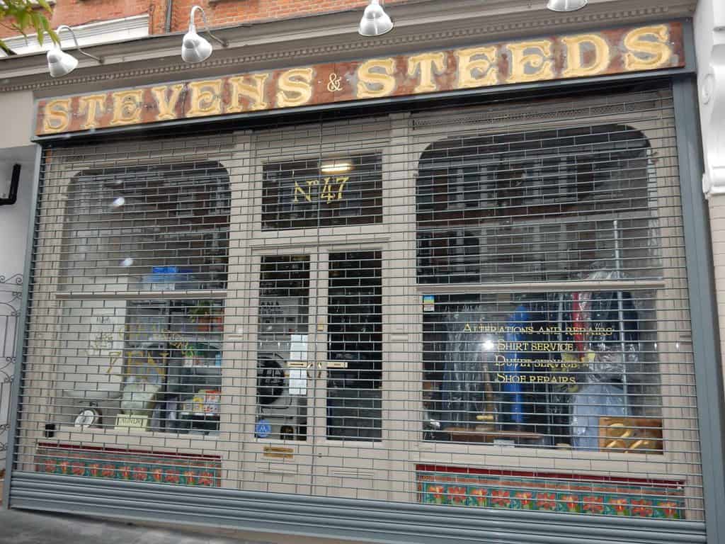 Directly opposite the palimpsest is another fading wall sign advertising Stevens & Steeds, a former grocers, again positioned for visibility from the train line. While this was there back in 2007 when I first visited, there are now the remains of a carved fascia present on the front of what is now a dry cleaners. This would once have been covered by a (likely gilded) glass piece, hence the rough edges around the letters which would not have been visible.