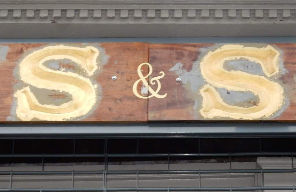 Looking closely, the ampersand in the middle has been redone recently, simply gilded on instead of being carved like the rest of the sign.