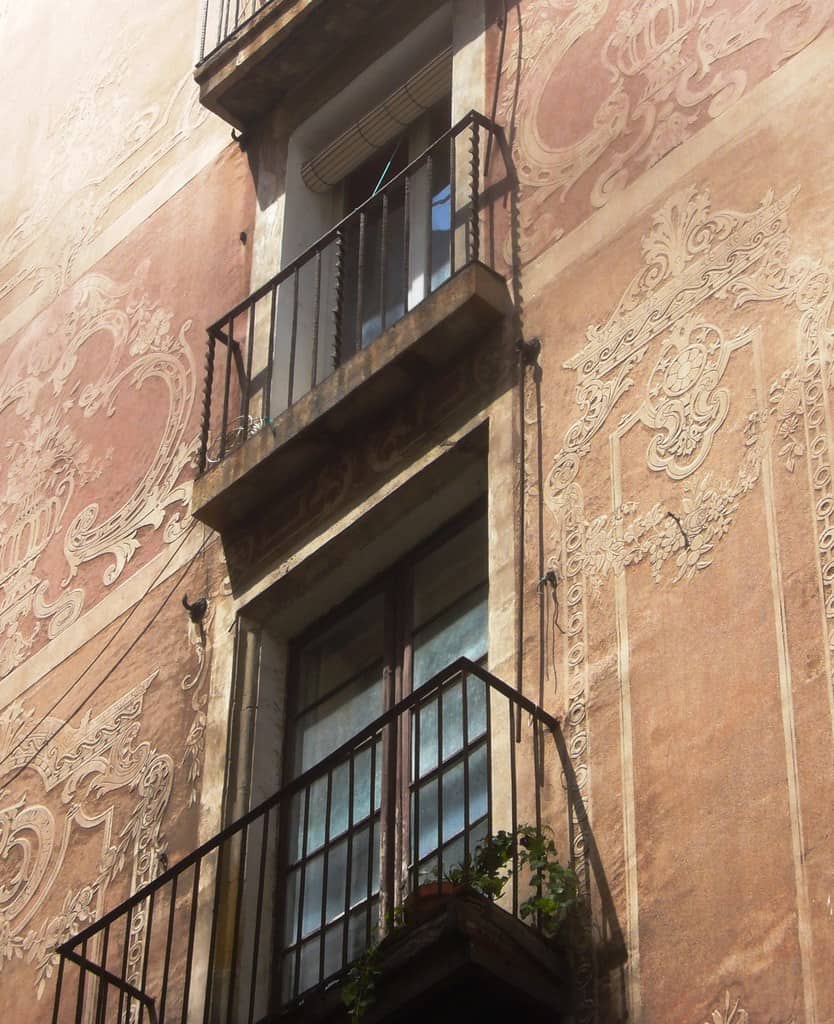 I’m very happy to have learned of this technique and will now be on the lookout for it elsewhere. In fact, it reminded me of these decorated walls in Barcelona and I wonder if they were produced in the same way? (The lighter colour seems much more raised above the surface so it could be another technique altogether.)