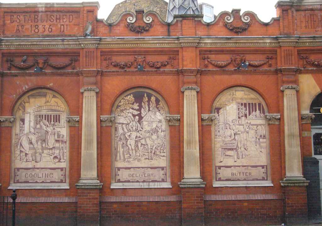 These pictorial panels depicting the products and services on what is now The Old Dairy on Stoud Green Road have always intrigued me, and ahead of next week’s talk at the North London Lettering Association I thought I should carry out a little research. The late-Victorian building once housed a branch of the Friern Manor Dairy Company, and a detailed history is available from the Hornsey Historical Society.