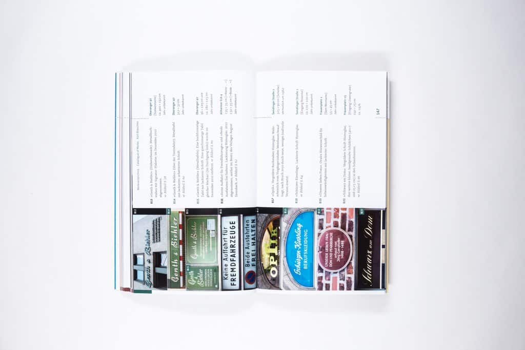 The rich visual material in the book consists of over 70 pieces, mainly from Blaschke, but also Heinrich Steigelmann who eventually took over the company having apprenticed under Blaschke. These are all documented photographically, with accompanying research (in German only) that includes location, date (where known), size and technical production details. An accompanying fold-out map allows the individual signs to be tracked down at street level, although many were lost while researching the book, and have no doubt done so since publication.