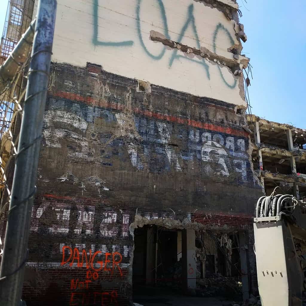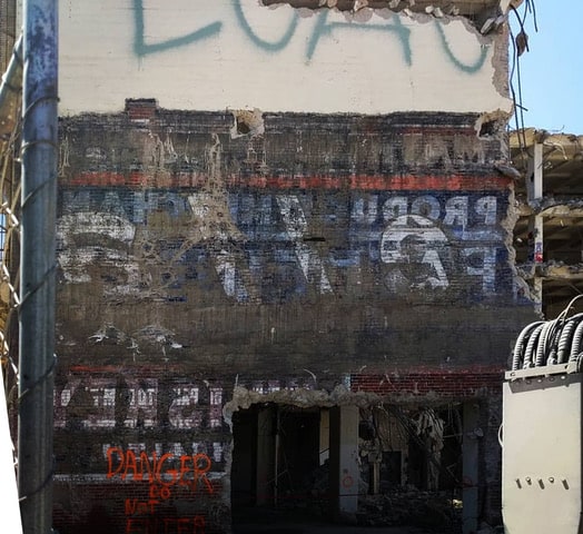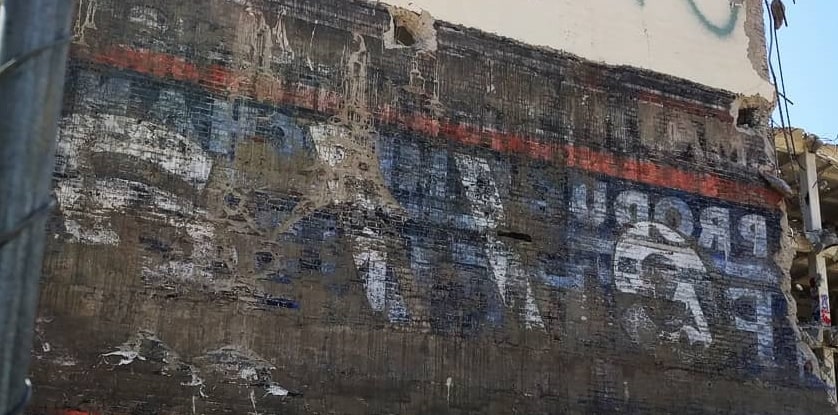 This ‘reverse’ ghost sign was recently revealed in Los Angeles and provides a third example of concrete setting and holding back the paint that once covered the wall of an adjoining building. (See two more examples posted previously here and here.)