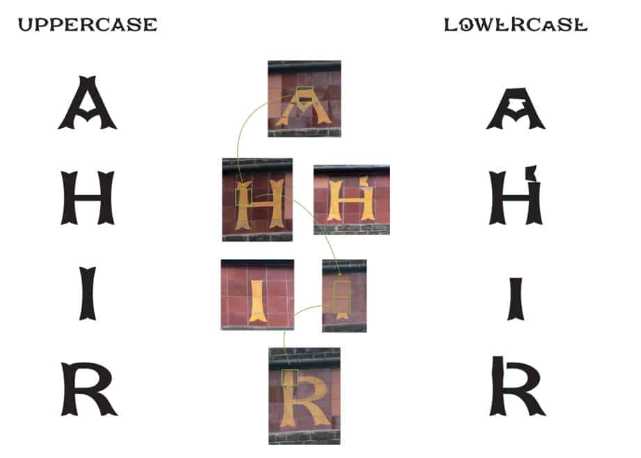 The letterforms have been interpreted in two ways for the design of the resulting font, with the corrected shapes forming the uppercase, while the lower case remains true to the current form of the sign.