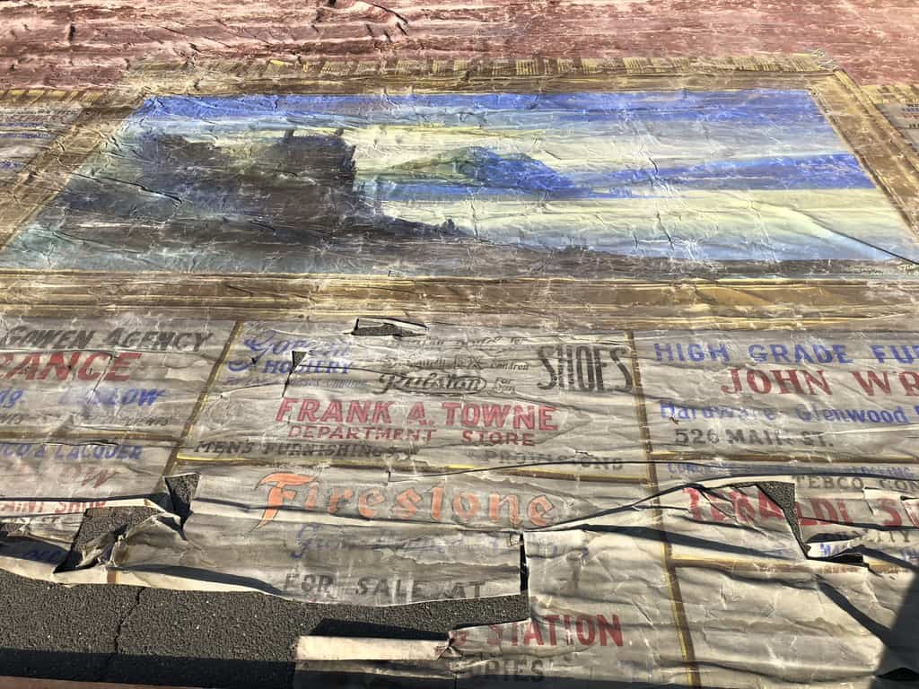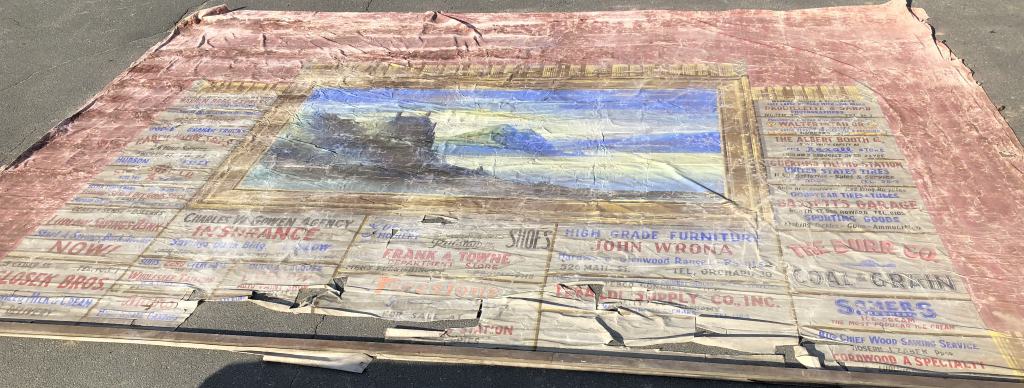 These installations were once commonplace, a direct precursor to commercials reels in cinemas. They would be installed in the theatres and painted with scenic illustrations for the use of all types of performers and events. Relatively few survive as they weren’t designed for long-term use, and were replaced when they fell into disrepair. The advertisements surrounding the scenic paintings would be sold to local businesses by the theatres and the groups performing in them.