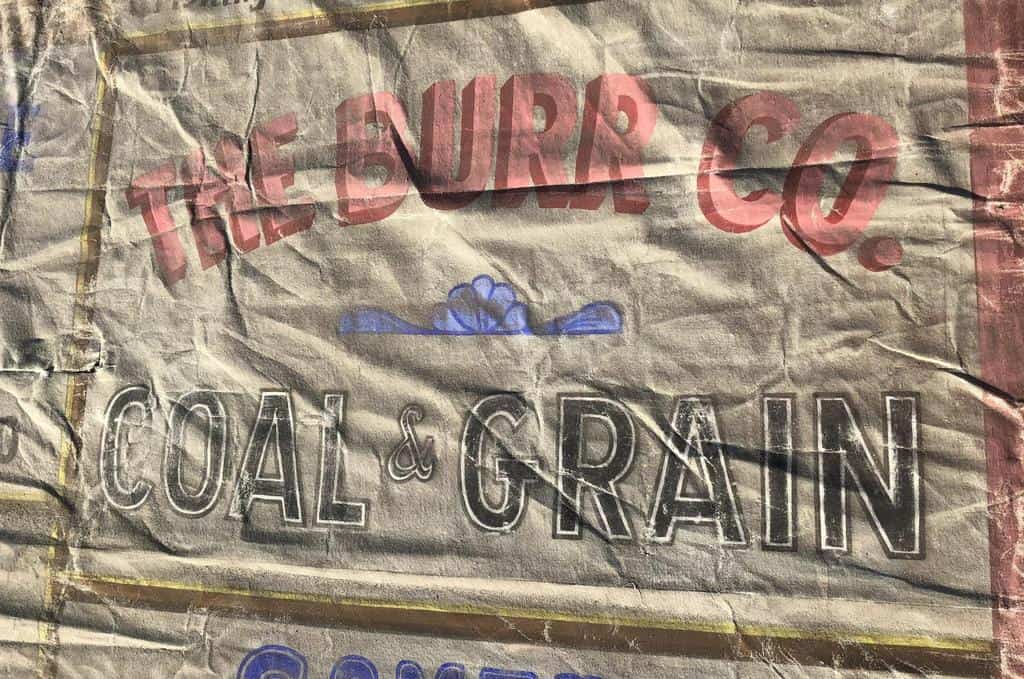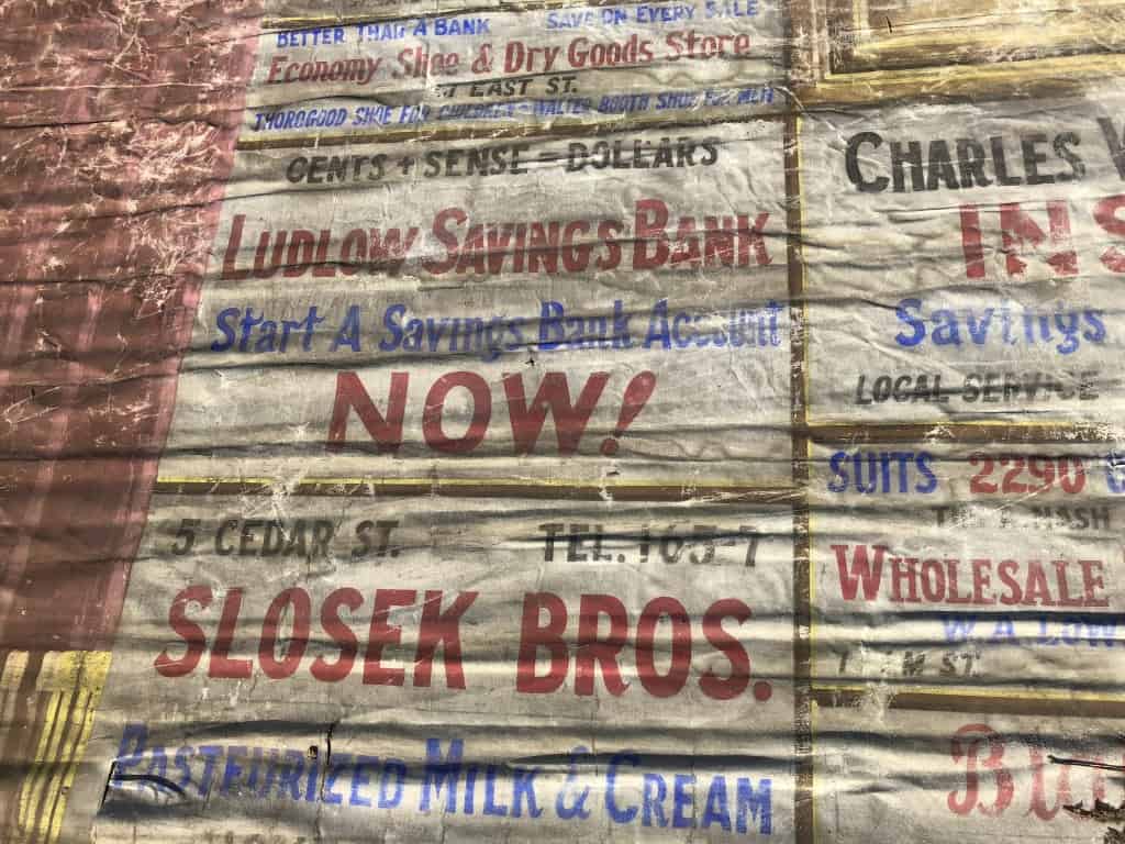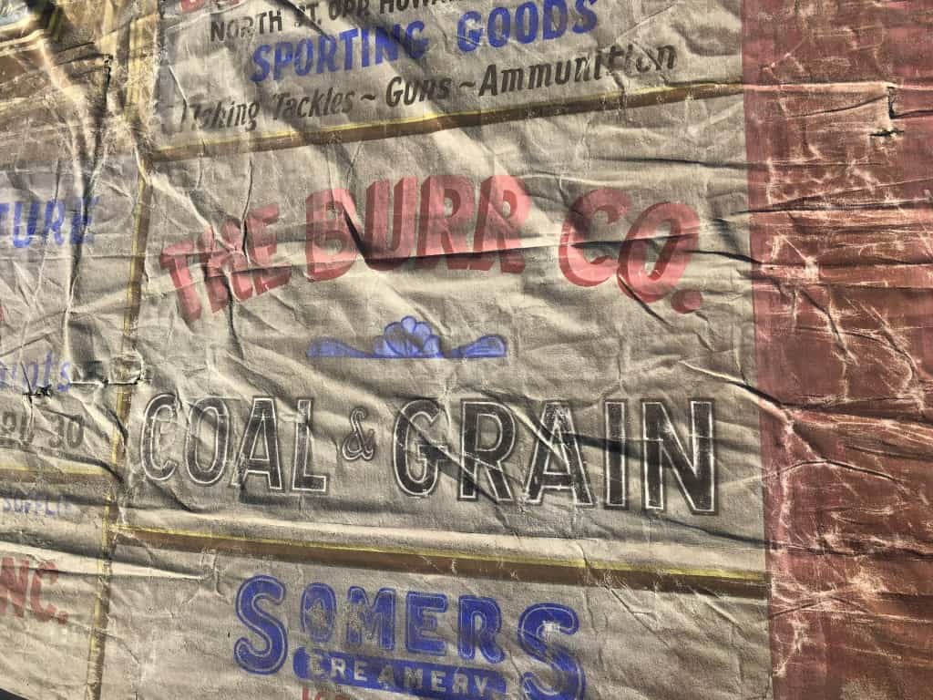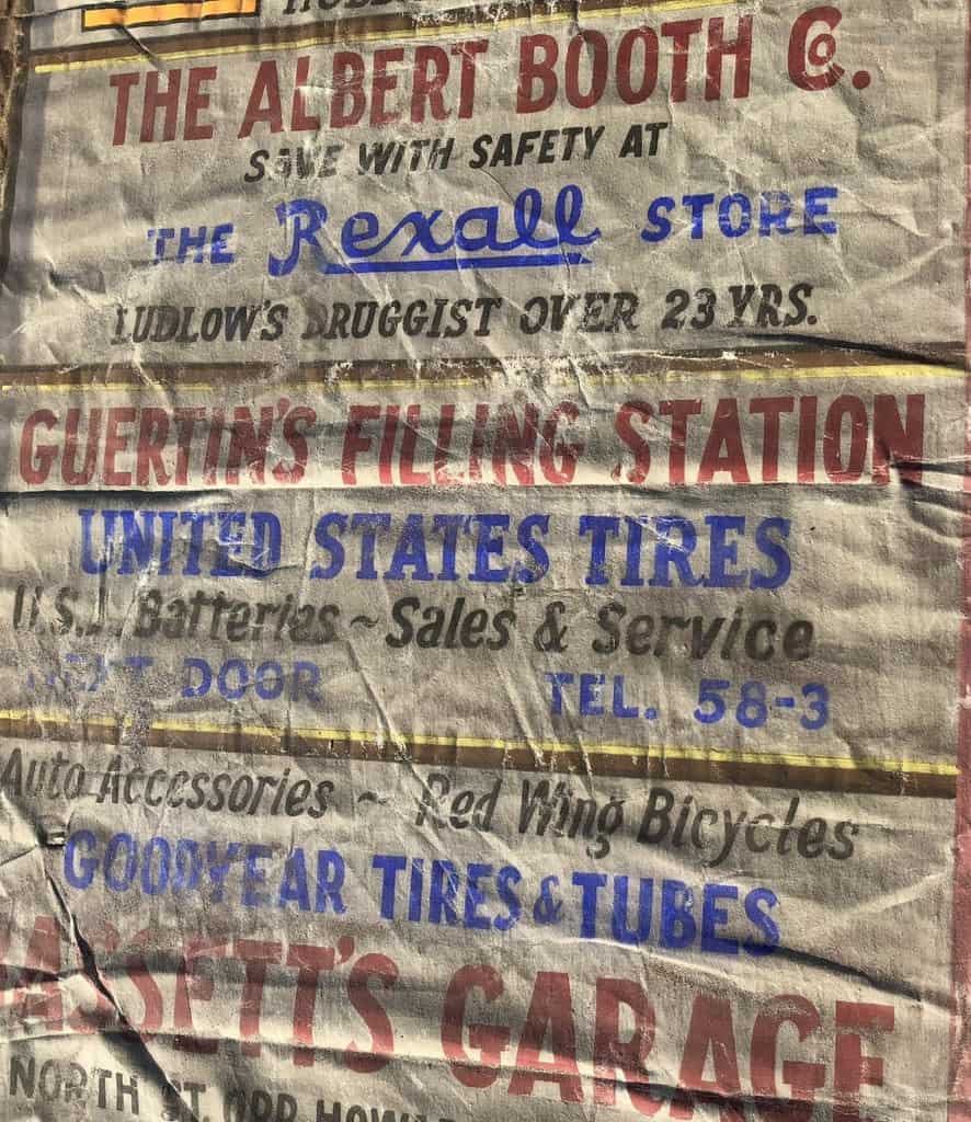 From 1927 to 1967 the Burr Theatre operated in Ludlow, Massachusetts. Its former home now sits empty on the premises of CA Smith Lumber & Feed, but recently piqued the curiosity of Sean Hastings, an attendee at one of our [Better Letters] workshops in nearby Providence. After looking inside the ‘ghost’ theatre, Sean discovered the stage still in place and, hanging above it, a curtain. This was decorated with a scenic illustration, surrounded by a series of hand-painted advertisements.