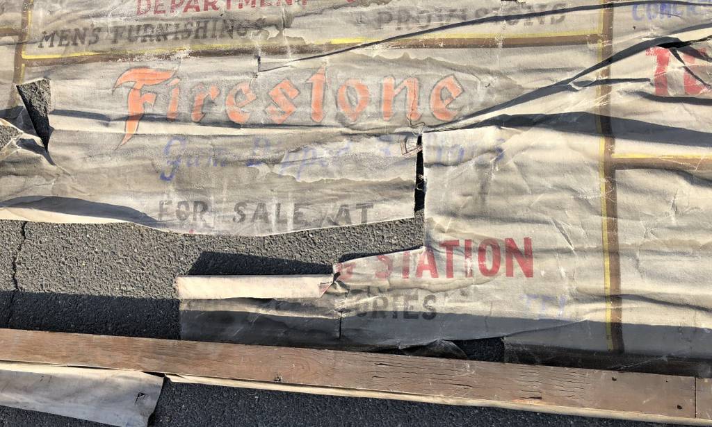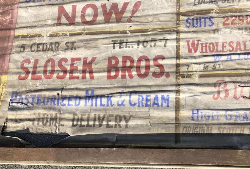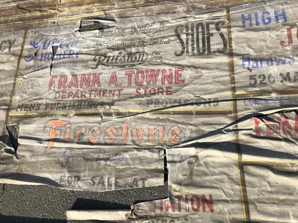 On this example the small advertising panels are nearly all composed with the same colour pallette of red, blue and black. In some cases a dash of yellow or orange has been used, and additional embellishments made to the flat letters, presumably at greater expense to the advertiser. In the case of Frank A. Towne’s department store there is substantially more copy squeezed into the allocated space than the majority of other signs, suggesting that he had the biggest budget of all! Many of the signs also include ‘privileges’ for larger manufacturing brands such as Firestone, Dodge and Goodyear.