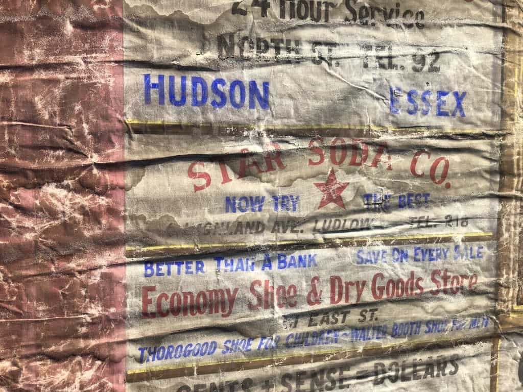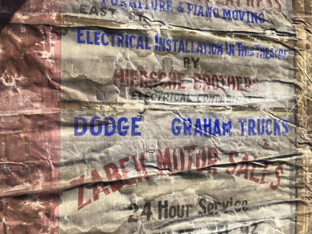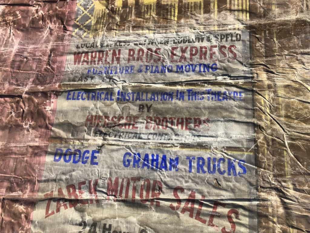 The scenic painting in the middle of the curtain is signed by ‘Maurice Tuttle Studio, Springfield’, which is about ten miles from the theatre. The brief biography on the Curtains Without Borders site helps date this particular curtain to the late 1920s or early 1930s. However, it isn’t clear if Tuttle was also responsible for the advertisements, or if these were produced by a sign painter affiliated with the last group to perform at the theatre.